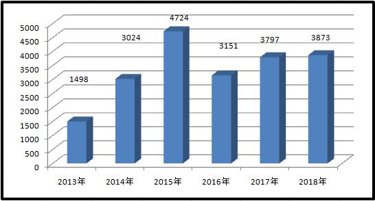 2013-2018年因政府信息公开提起行政诉讼情况对比图(单位:件)