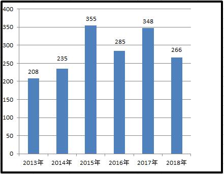 2013-2018年因政府信息公开提起行政复议情况对比图(单位:件)