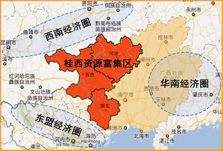 桂西资源富集区(以下简称桂西地区)是指地处广西壮族自治区西部的河池、百色、崇左三市所辖的30个县(市、区),土地面积8.71万平方公里,占全区总面积37.8%。2010年末总人口1017万人,占全区总人口19.7%,是广西少数民族主要聚居地区,集革命老区、边疆地区、民族地区、连片特困地区、大石山区和水库库区于一体,具有资源富集、生态脆弱、沿边开放、扶贫开发、西南出海大通道支撑点等鲜明特征,是我国西南自然资源丰富、民族文化浓郁、区位条件较好、发展潜力较大的地区,是国家西部大开发“十二五”规划明确支持建设的8个重点能源资源富集地区之一。
