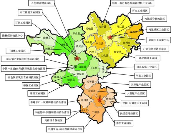 河池:河池·南丹有色金属新材料工业园区、广西宜州经济开发区、河池城区工业园区、环江工业园区、金城江工业集中区、河池综合物流园区、都安临港工业园。 百色:新山铝产业循环经济示范园区、百色工业园区、百色综合物流园区、右江桂明工业园区、田东石化工业园区、平果工业园区、德保工业园区、靖西工业园区、田林工业园区、中国—东盟(田阳)国际现代农业物流园、百色国家现代农业科技园区。 崇左:崇左工业园区、中国-东盟青年工业园、扶绥空港经济区、凭祥综合保税区、中越凭祥-同登跨境经济合作区、中越水口-驮隆跨境经济合作区、中越爱店-峙马跨境经济合作区,天等锰产业园区、大新锰产业园区。 |