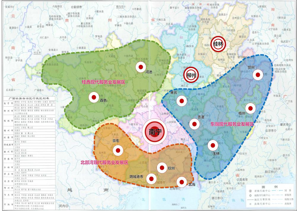 南宁市:华尔街工谷科技服务业集聚区、联讯U谷科技服务业集聚区。 柳州市:广西工业设计城、柳州大数据产业园。 桂林市:桂林华为生态信息产业园、花江智慧谷电子信息创业产业园。 梧州市:梧州苍海高端服务业集聚区、广西中和国际陶瓷交易中心。 北海市:北海红树林现代金融产业城、北海市高端服务业集聚区。 防城港市:防城港北斗导航科技产业园、防城港市医学创新生态科技产业园。 钦州市:钦州华为数字小镇、钦州港区跨境贸易电商产业园。 贵港市:贵港义乌中国小商品智慧新商业产业园、中国—东盟电动车交易中心。 玉林市:玉林国际陆港、玉林福绵国际电商牛仔轻纺城。 百色市:百色国际金融科技城、百色红色文化旅游服务业集聚区。 贺州市:贺州足球小镇、广西黄金珠宝产业园。 河池市:巴马数字基金小镇、宜州茧丝绸产业服务集聚区。 来宾市:兴宾区电子商务产业园、来宾市滨港智慧物流园。 崇左市:凭祥市边境贸易服务综合示范区、扶绥空港现代服务业集聚区。 |