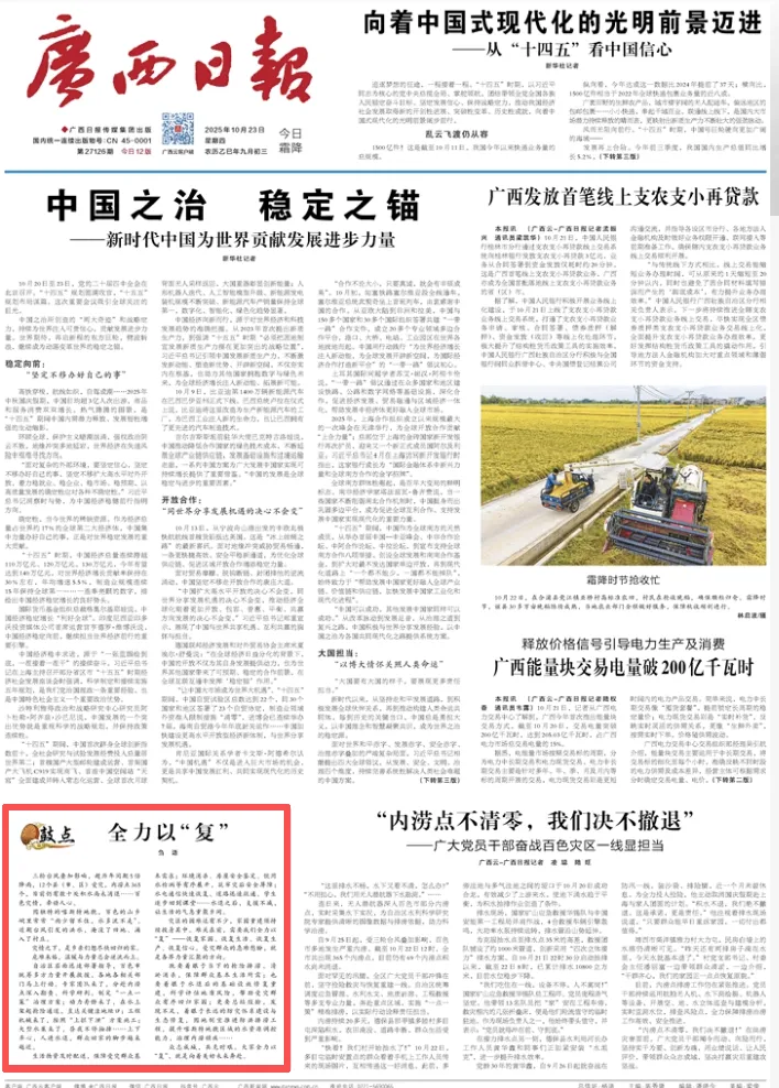 10月23日,广西日报头版刊发“鼓点”评论文章《全力以“复”》。全文如下——