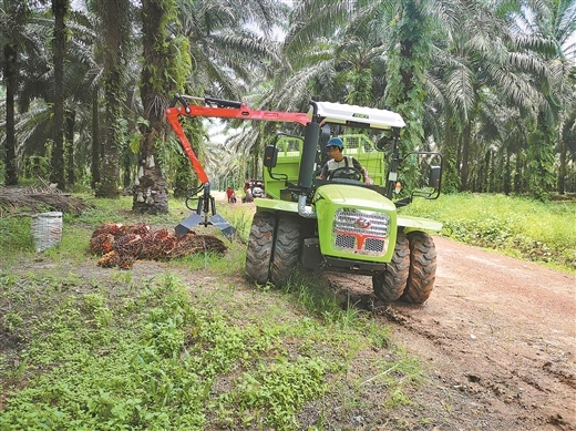 惠来宝公司生产的山地拖拉机在印度尼西亚棕榈园作业。(企业供图)