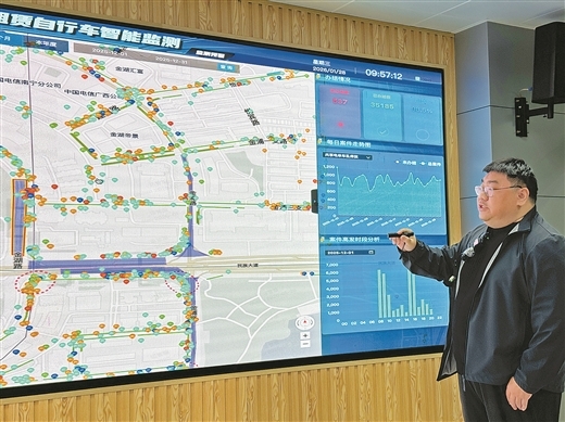 工作人员通过互联网租赁自行车智能监测系统实时监测共享电单车停放情况。