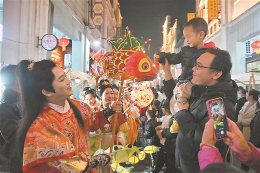 夜幕轻垂,朱红灯笼缀满骑楼檐角,暖黄灯火漫过青石板路,晕染出一帧帧温润雅致的古巷诗行。平陆运河施工的机械声,如奋进鼓点,与老街更新的节奏共鸣,融进晚风。油炸假蒌饼的滋滋脆响、摊主的清脆吆喝、游人欢笑,汇成一曲鲜活滚烫的城市交响。
