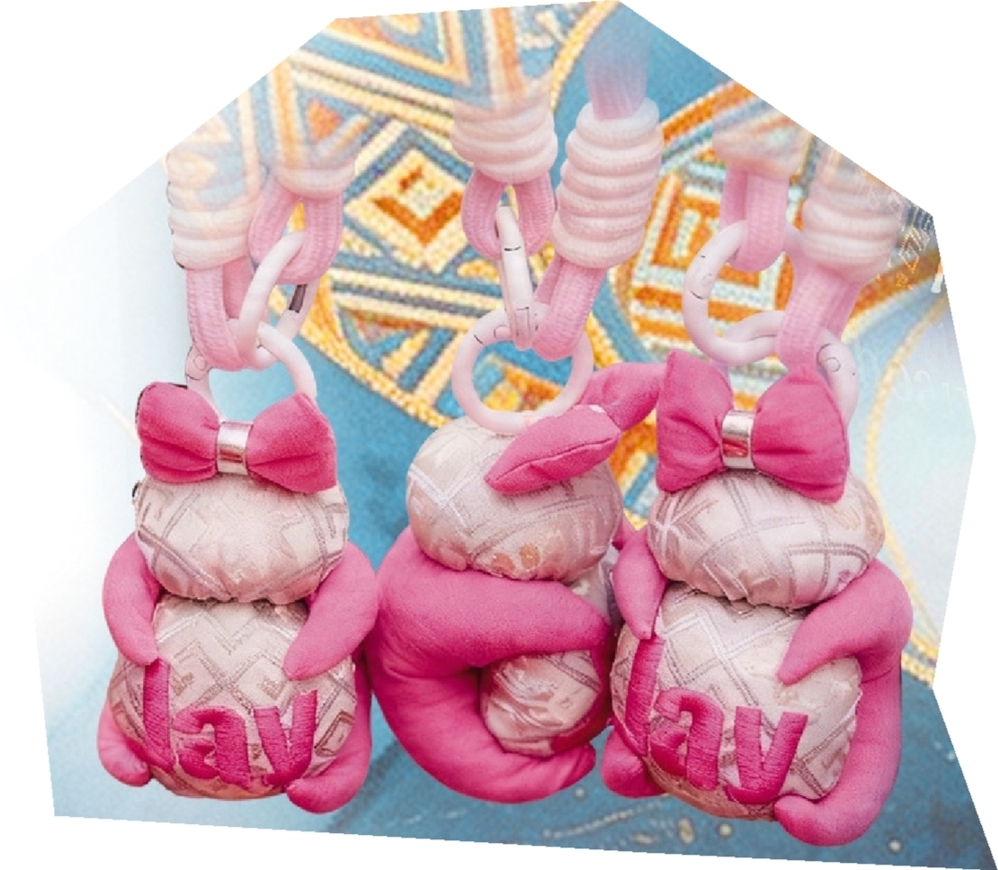 “甜甜的绣球包”由右江壮族麽乜制作技艺代表性传承人朱少燕设计,粉红色调呼应演唱会“甜甜的”主题,外表沿用传统的12瓣结构,绣着周杰伦的英文名“Jay”;内里中空,创新设计为可开合收纳包,兼顾美观和实用。同款麽乜应援公仔,摒弃了蓝、白、红等传统配色,在“人抱龙珠”基础造型上,设计成头戴粉色蝴蝶结的米白公仔,圆滚滚的肚皮上绣着粉红色的“Jay”,这款极具辨识度的Q版麽乜公仔,跟壮锦绣球包一样,成就了广西歌迷独一份的浪漫。